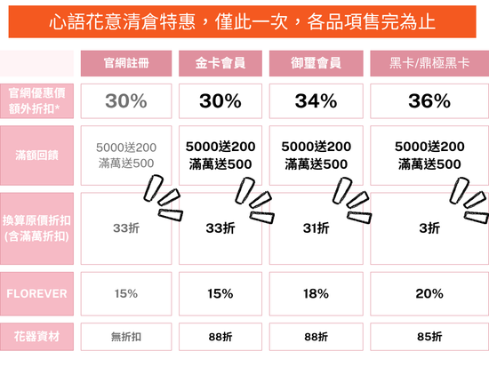 各位支持心語花意的夥伴們, 很謝謝您們長期的支持,因應心語花意後續營業上可能的規劃與調整,將進行唯一一次的清倉特惠活動。為了感謝與回饋大家,將以最低的優惠折扣提供給各會員。 因為各品項後續將有長時間不再補貨,所以售完為止,同時,避免清倉特惠帶來的不確定情況,本活動保有隨時暫停或終止的權利,若有造成各位的不便,我們致上最誠摯的歉意。 以下為各會員於清倉期間享有的特惠,若有任何操作或優惠上的疑問,歡迎隨時來信或於粉絲專頁私訊我們~Read more -
